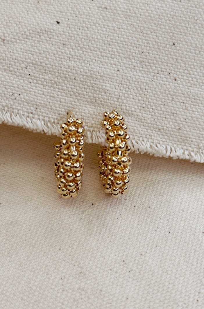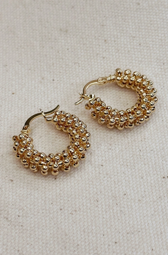 Enhance your jewelry collection with our 18k Gold Filled Beaded Cluster Hoop Earrings, designed to blend timeless elegance with modern flair. These handcrafted earrings from Brazil showcase exquisite craftsmanship, featuring a 25mm diameter and 5mm width for a statement look. Made from hypoallergenic and waterproof 18k gold-filled material, they offer both luxury and durability, making them the perfect accessory for everyday wear or special occasions. Elevate your style with these stunning hoop earrings that effortlessly add a touch of sophistication to any outfit.