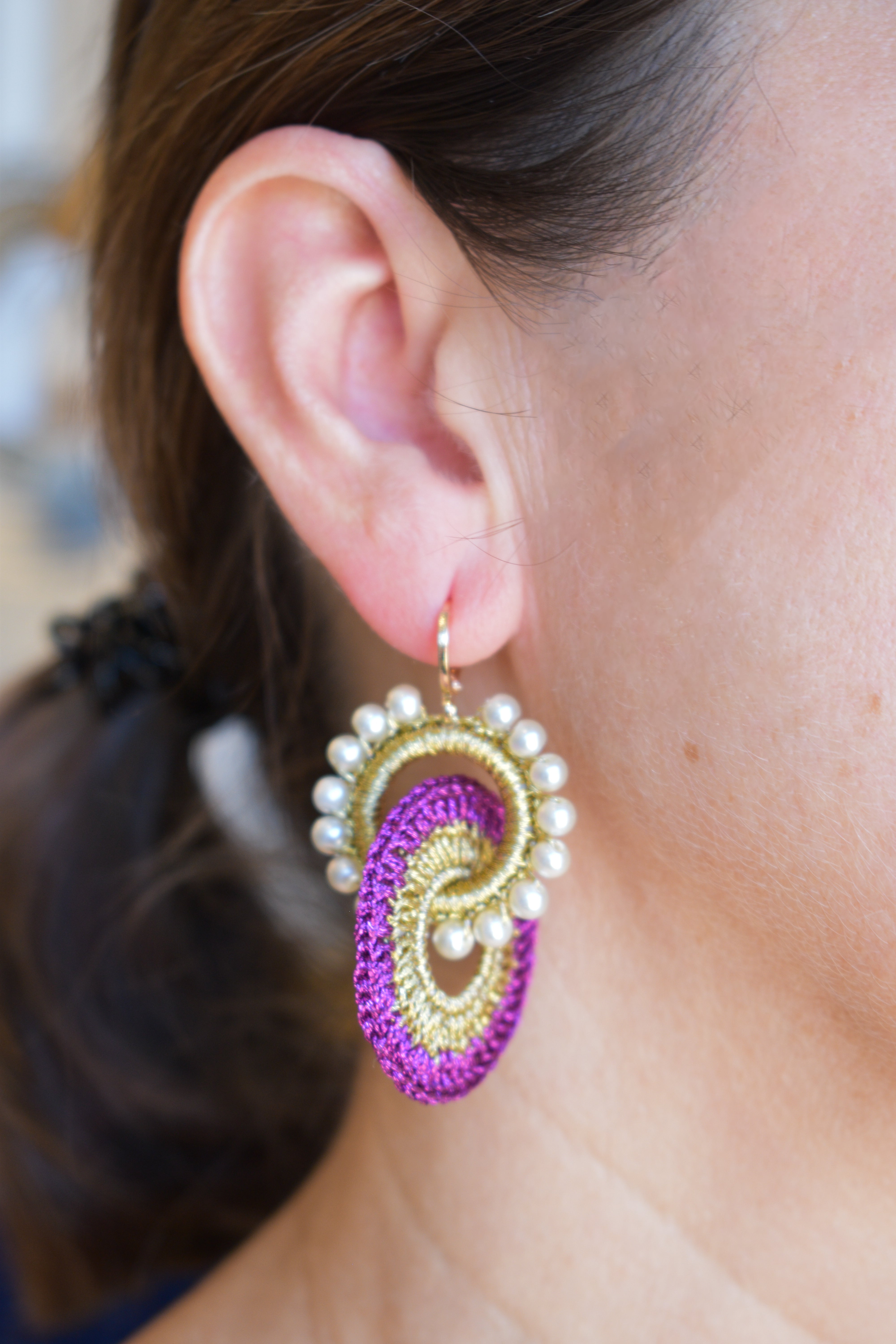 Bold, radiant, and unmistakably unique — the Magenta Eclipse Earrings are a stunning statement piece handcrafted to elevate any look. Featuring intertwined magenta and gold threadwork with a delicate halo of luminous faux pearls, these earrings blend traditional artistry with modern flair. Their sculptural silhouette catches the light beautifully, adding dimension and elegance from every angle.
