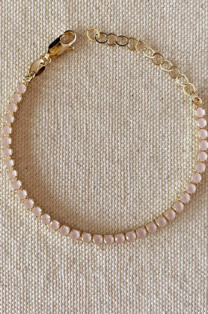 A gorgeous nude pink bracelet in light pink cubic zirconia to give you colors in this new season. * Metal: 18k gold filled * High-quality cubic zirconia AAAAA * 3mm Nude Pink Bracelet * Size: 6 inches with 1.5 inches extender chain for a total adjustable length of 7.5 inches. * Hypoallergenic and waterproof * Handmade with love by GoldFi in Brazil