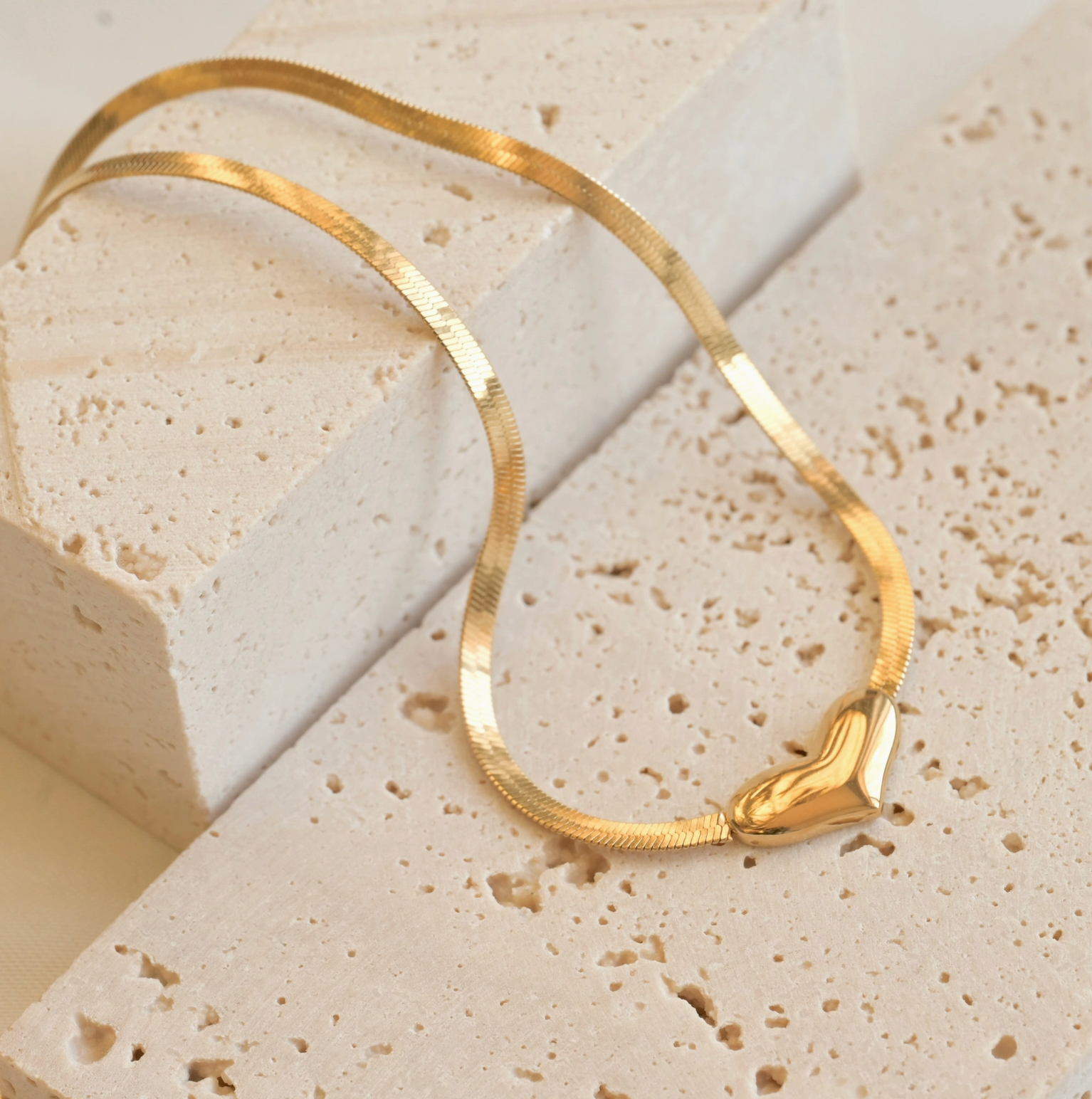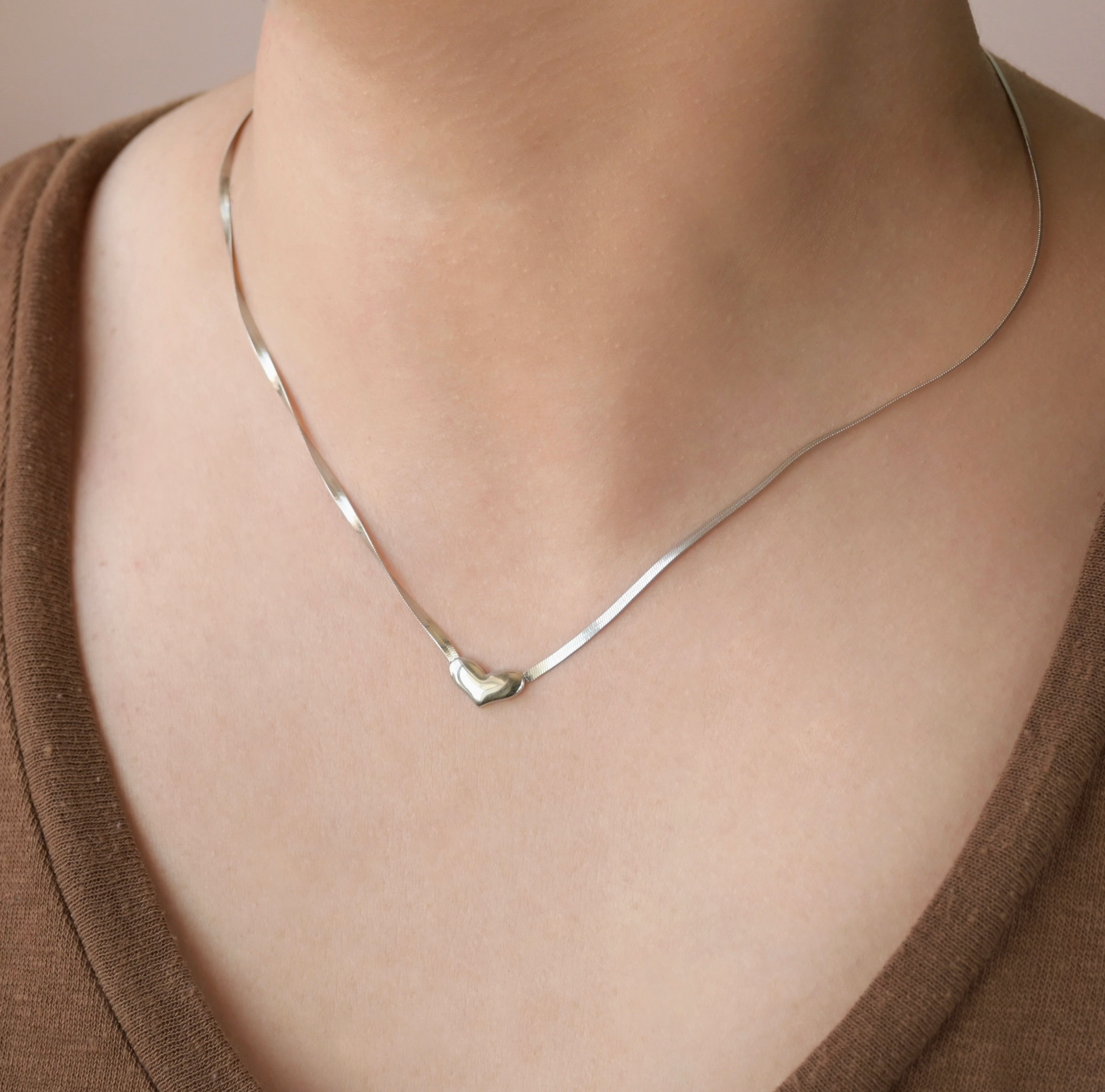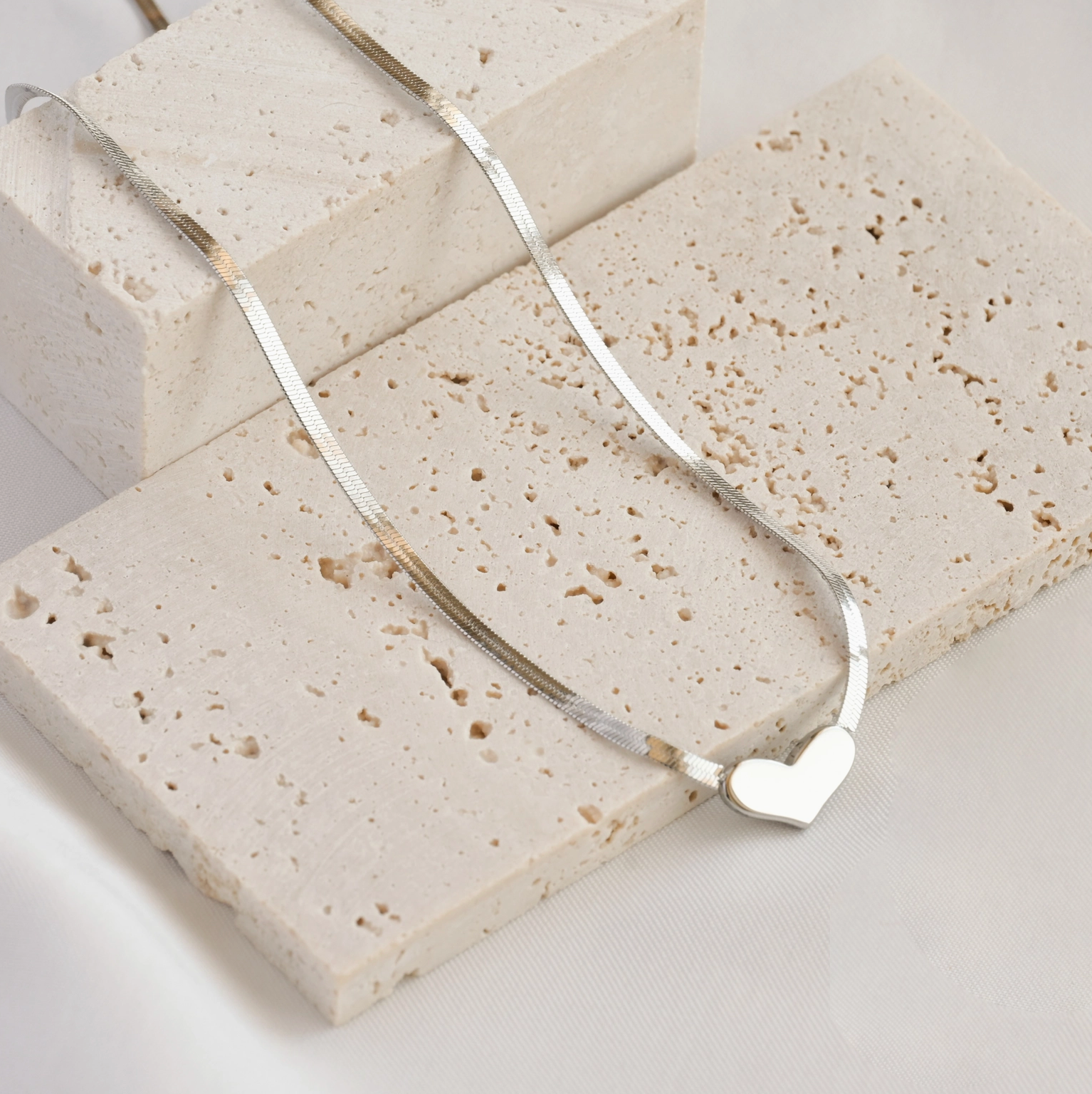 Elevate your style with the Herringbone Heart Necklace, an elegant piece that combines timeless design with modern flair. Crafted from durable stainless steel, this necklace features a stunning 7x13mm heart charm on a 2mm herringbone chain. Available in a gorgeous silver and 18k gold PVD-plated finish, it’s perfect for any occasion, adding a touch of sophistication to your jewelry collection.