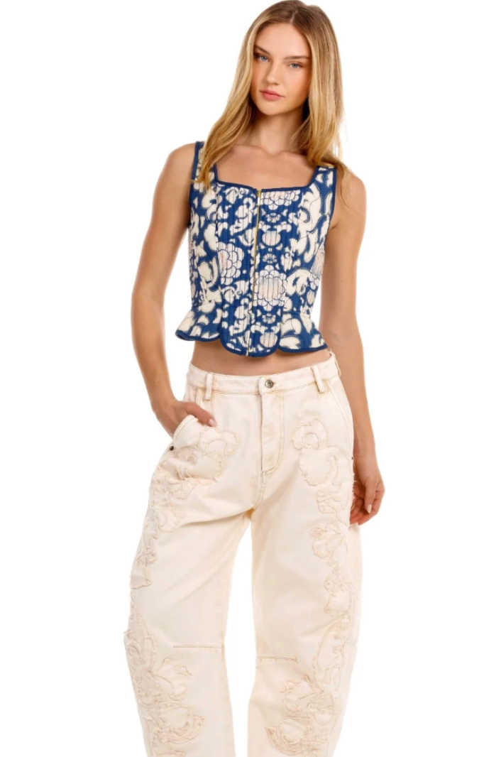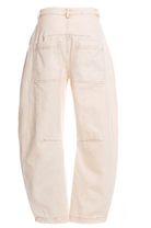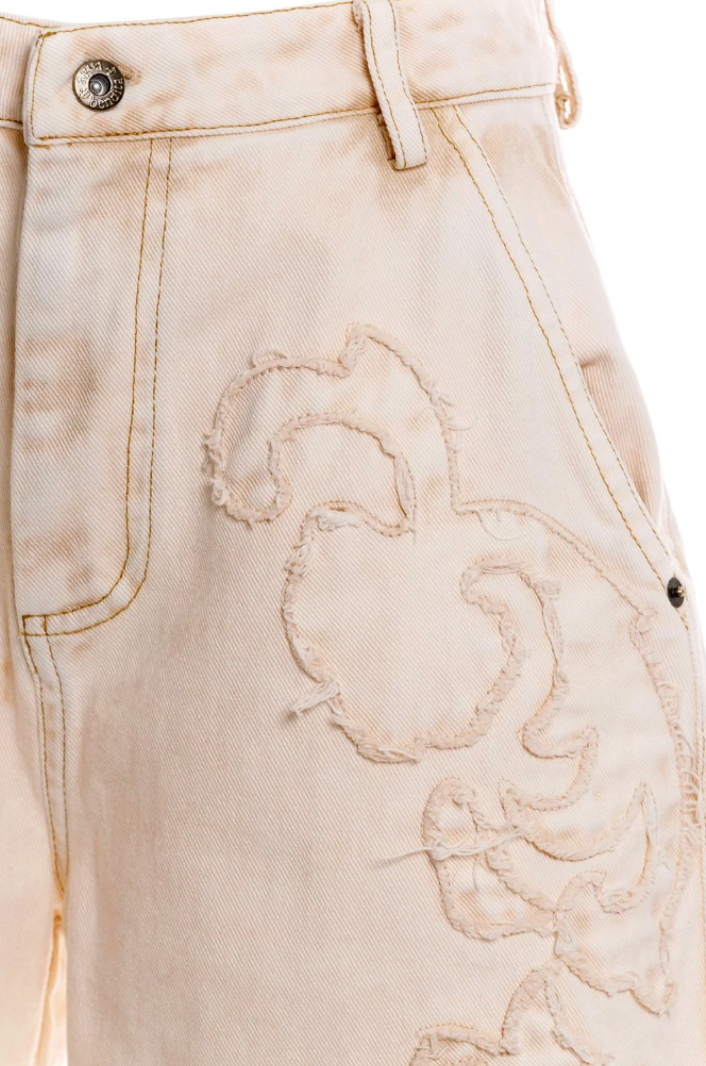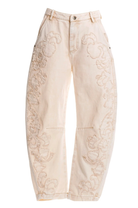 Introducing the Fallon Sereia Pants—where understated elegance meets effortless style. These thoughtfully designed trousers showcase a relaxed barrel silhouette enhanced by delicate distressed floral embroidery along the sides. Intentional fading and subtle whiskering create an authentically worn aesthetic that feels both refined and approachable. Constructed from pure 100% cotton, they feature a zip fly with button closure and generously proportioned side and back pockets for practical sophistication. Perfect for those who appreciate garments with character and substance.