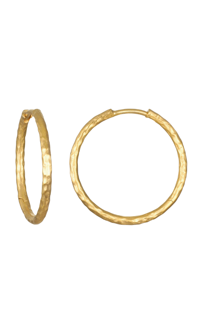 Crafted with an 18K gold-plated brass hoop and a secure 18K gold-plated 925 sterling silver huggie-style closure, these earrings offer both style and comfort for all-day wear. Timeless yet contemporary, they are an essential accessory for anyone who loves classic gold jewelry with a textured, artisanal touch.