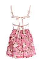 The vibrant pink placement print adds romantic dimension, while the softly pleated skirt enhances movement and volume. An open back with adjustable strap detail introduces modern contrast, and a discreet zipper closure ensures a smooth, seamless fit.