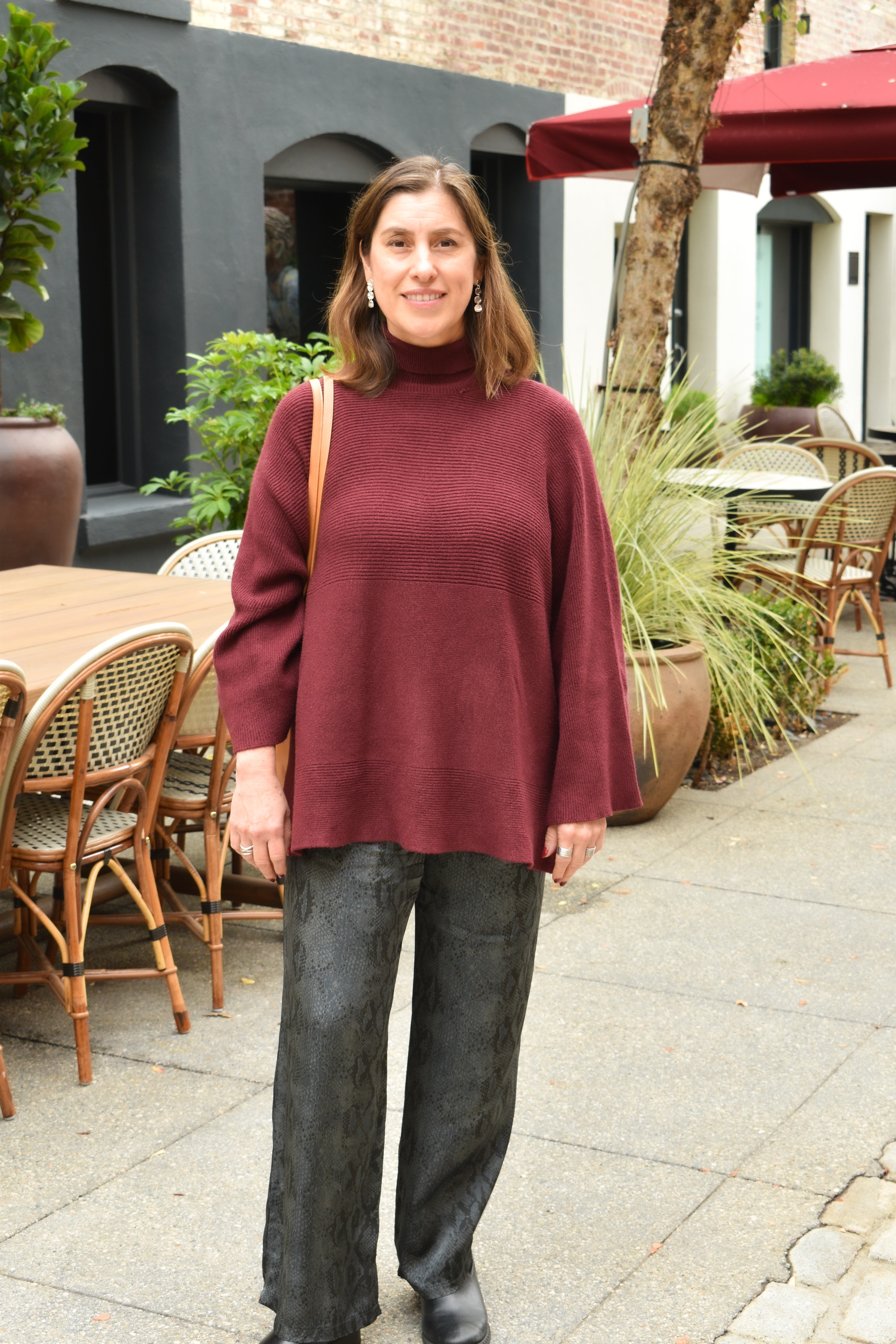 Design Details: Relaxed turtleneck, wide sleeves, and an easy, draped fit