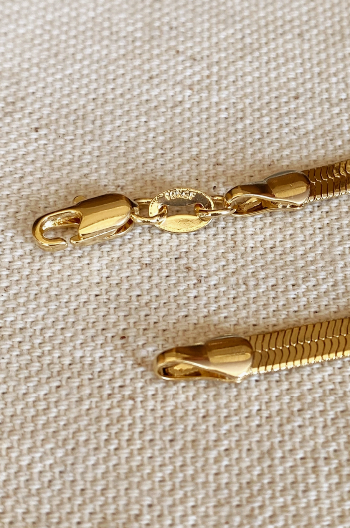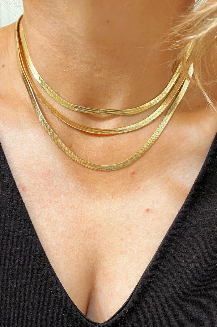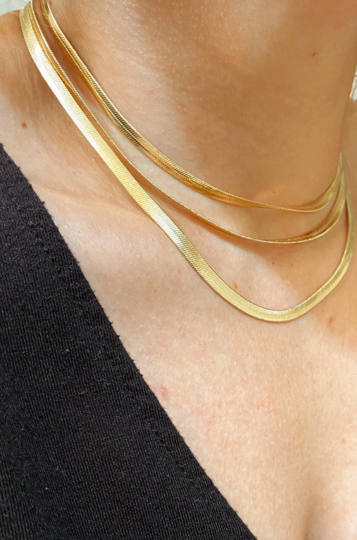 Introducing the Herringbone Chain Necklace—a timeless piece with a touch of luxury. This 4.0mm thick herringbone chain is crafted from fine 18k gold filled 1/20, blending durability and elegance in every link. At an ideal 18 inches, it drapes perfectly on the neckline, creating a sleek and sophisticated look that complements any outfit.